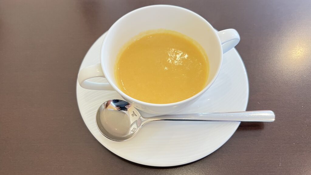 セットのにんじんスープは、にんじんの自然な甘みがやさしく広がるほっとする味わい。