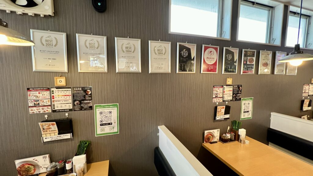 壁には各種コンテストやグルメサイトの賞状がずらりと並び、担々麺への自信と実績が伝わってきます。