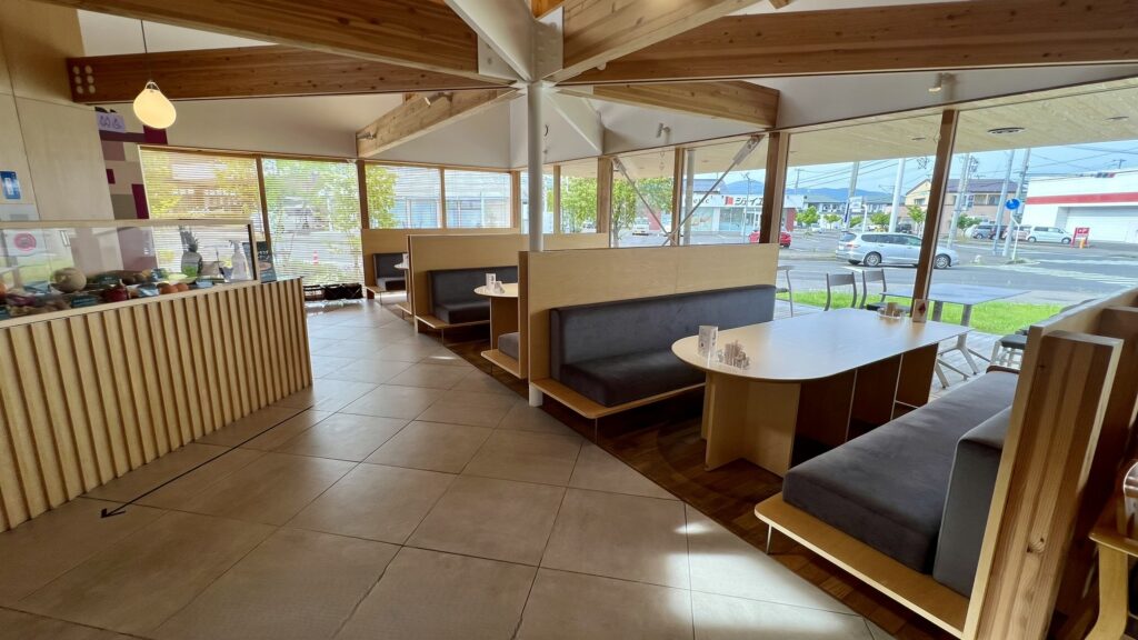 高い天井と大きな窓が開放感を演出し、自然光がたっぷりと差し込む明るい店内。