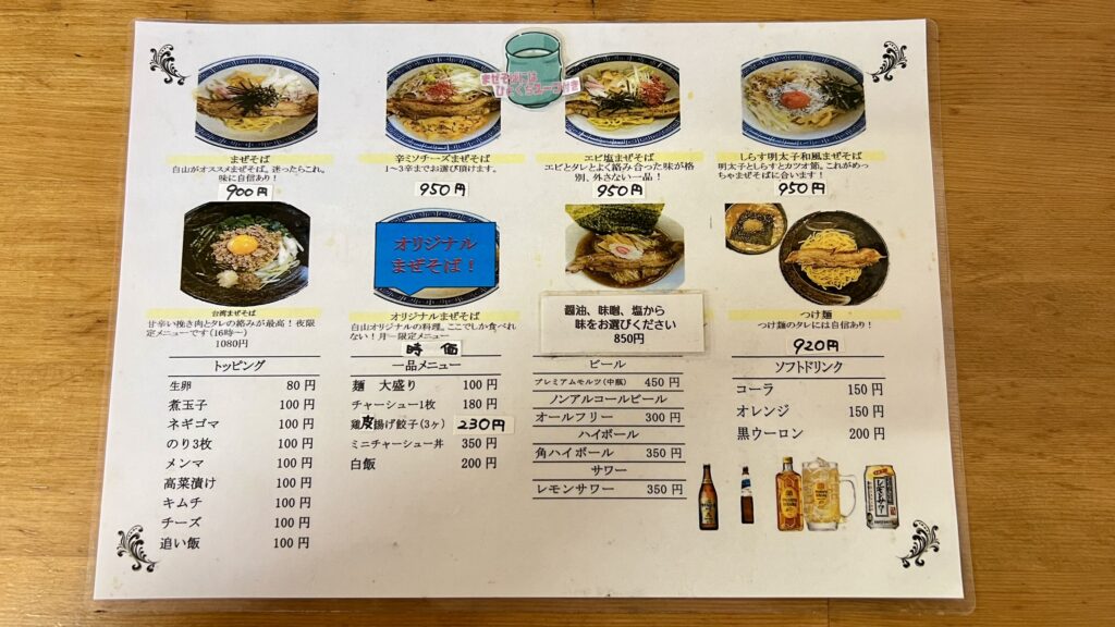 「まぜそば 二代目 白山」では、その名の通り各種まぜそばが主役。