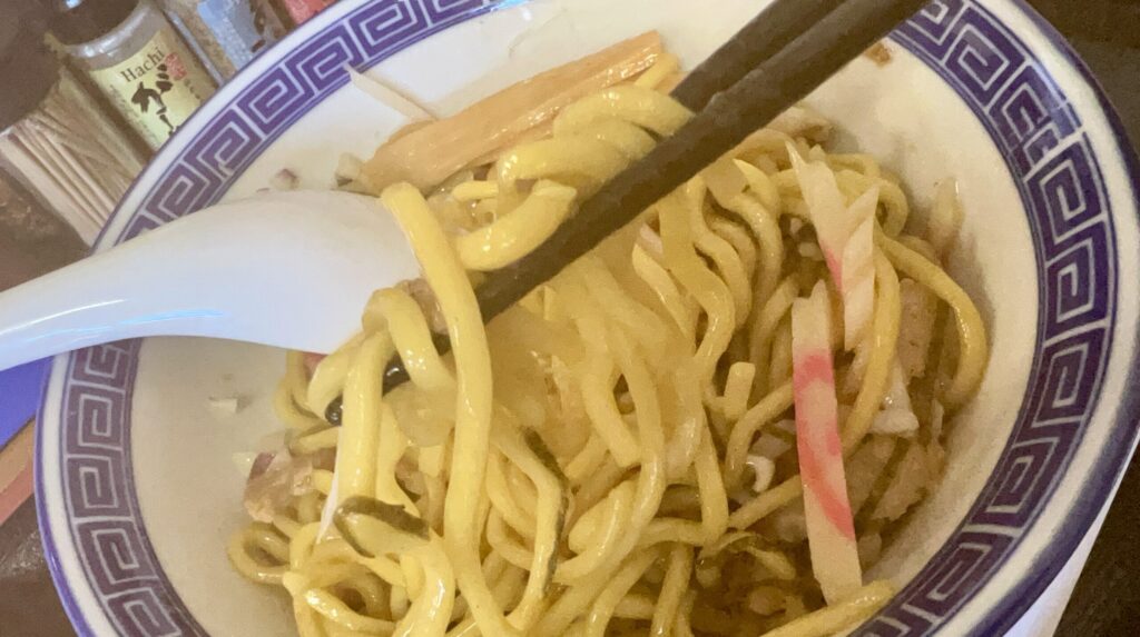 太麺はもちもちとした食感で、タレがよく絡み、しっかりとした食べごたえがあります。
