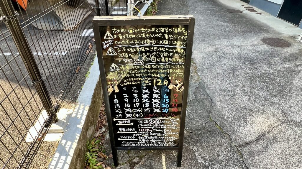 店先には手書きの黒板看板も出ていて、営業日カレンダーや案内がまとめられているので、来店前にひと通り確認できるのが助かります。