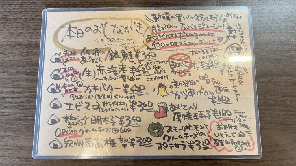 汁物のほか、からあげ・厚焼き玉子などのサイドメニューも揃っているので、おにぎりと合わせて食事として組み立てやすい印象でした。