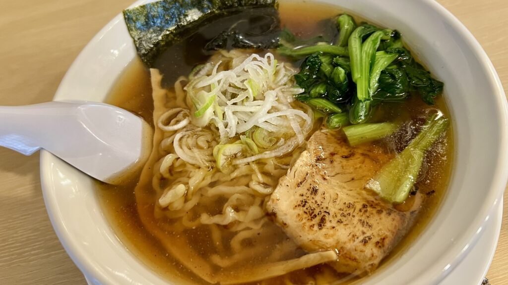 透明感のあるスープに、チャーシュー、ねぎ、メンマ、海苔、青菜がきれいに並んだ、王道の中華そばらしい佇まいです。