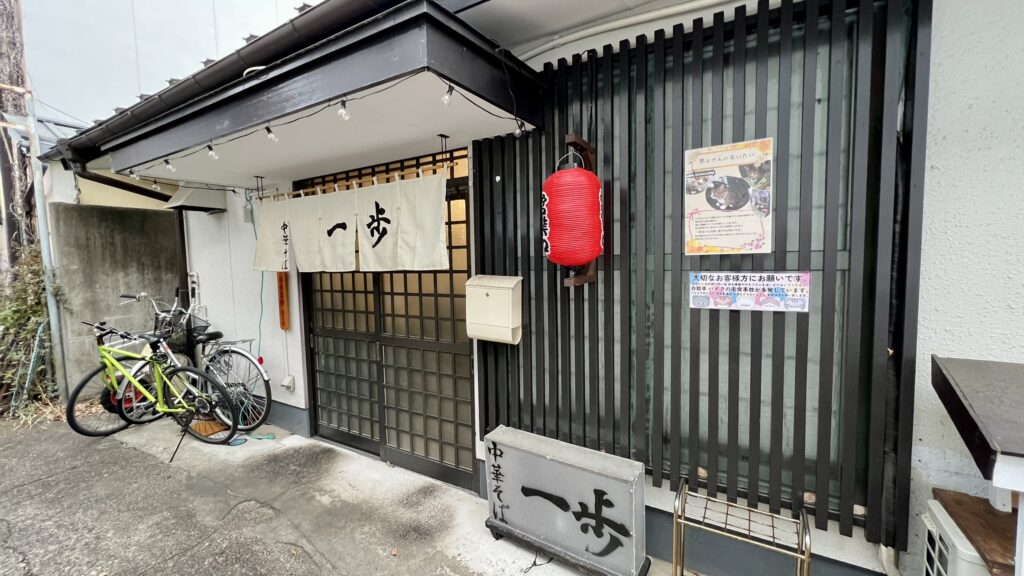 白い暖簾に書かれた「中華そば 一歩」の文字と赤提灯が印象的。