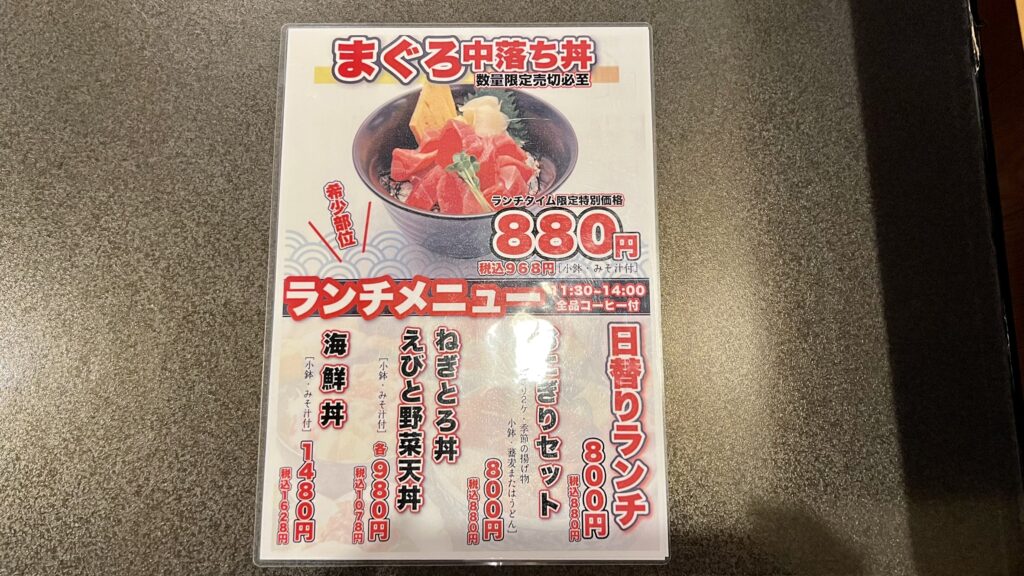 ランチメニューは、海鮮丼やねぎとろ丼などの海鮮系メニューを中心に、おにぎりセットや日替わり定食など、海鮮居酒屋らしい構成。