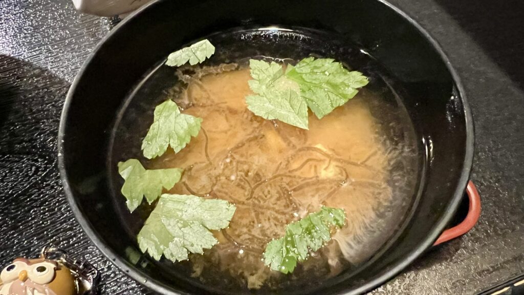 味噌汁にはもずくと三つ葉が入り、つるりとした喉ごしと香り高さが際立ちます。