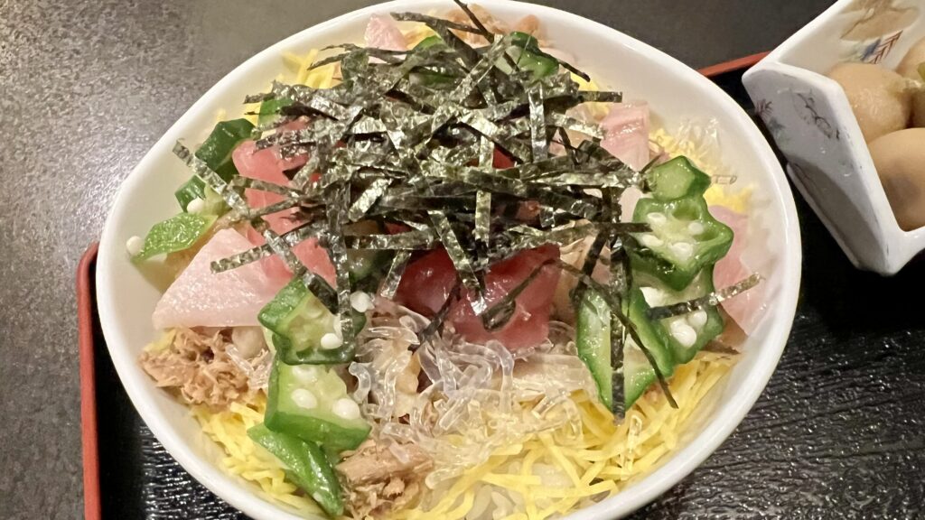 丼には、まぐろ・あなご・オクラ・錦糸卵・ツナ・春雨・刻み海苔などが彩りよく盛り付けられ、見た目にも華やか。