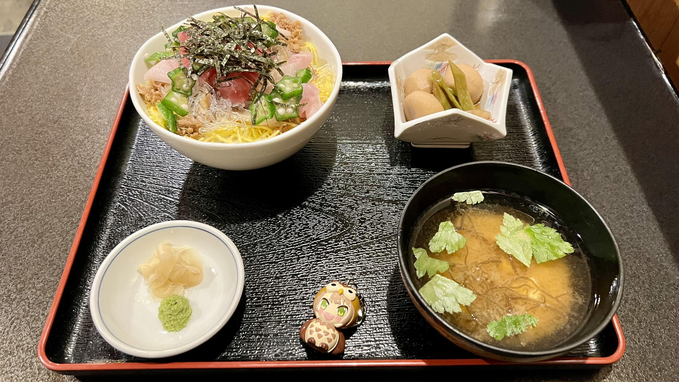 丼には、まぐろ・あなご・オクラ・錦糸卵・ツナ・春雨・刻み海苔などが彩りよく盛り付けられ、見た目にも華やか。