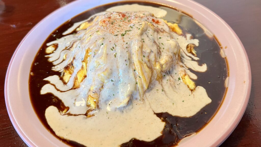 お皿の中央にふんわり玉子の山がのっていて、そこへデミソースとボルケーノソースがたっぷり。