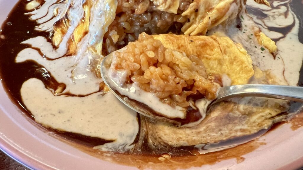デミのコクにボルケーノソースのクリーミーさが重なって、コクはしっかりめで、食べごたえのある味わい。