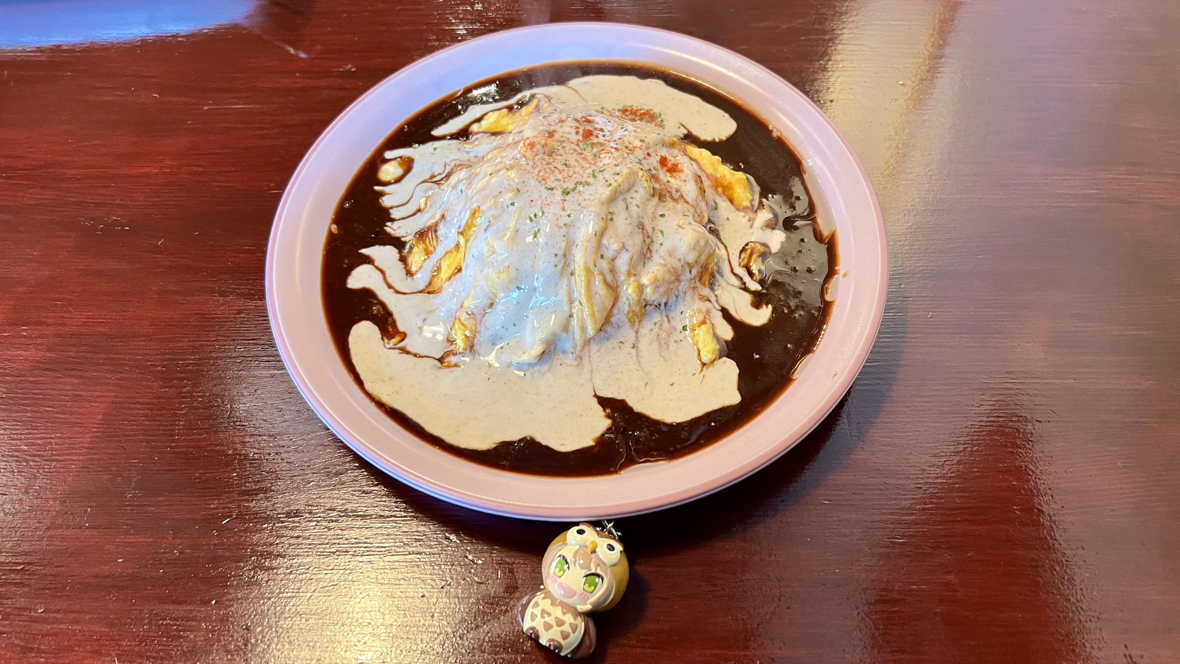 お皿の中央にふんわり玉子の山がのっていて、そこへデミソースとボルケーノソースがたっぷり。