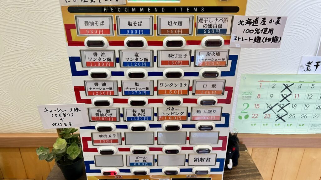 ・醤油/塩/ワンタン麺/担々麺など、選択肢が豊富