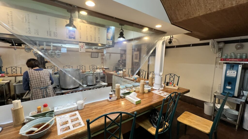 店内は、厨房をぐるりと囲むようにカウンター席が配置された昔ながらの造り。