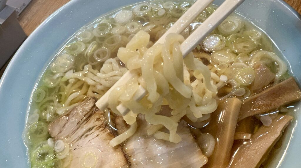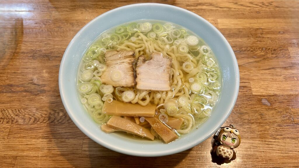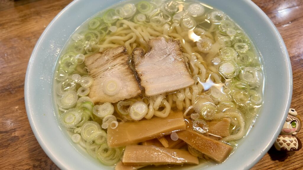 澄んだ色合いのスープに、チャーシュー・メンマ・刻みねぎがのった、シンプルな一杯です。