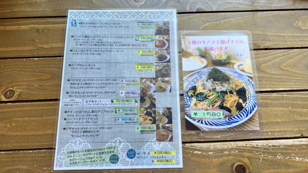 料理のメニューは洋食を中心に構成されており、シチュー、オムライス、カレー、パスタなど、カフェらしい定番がしっかり揃っています。