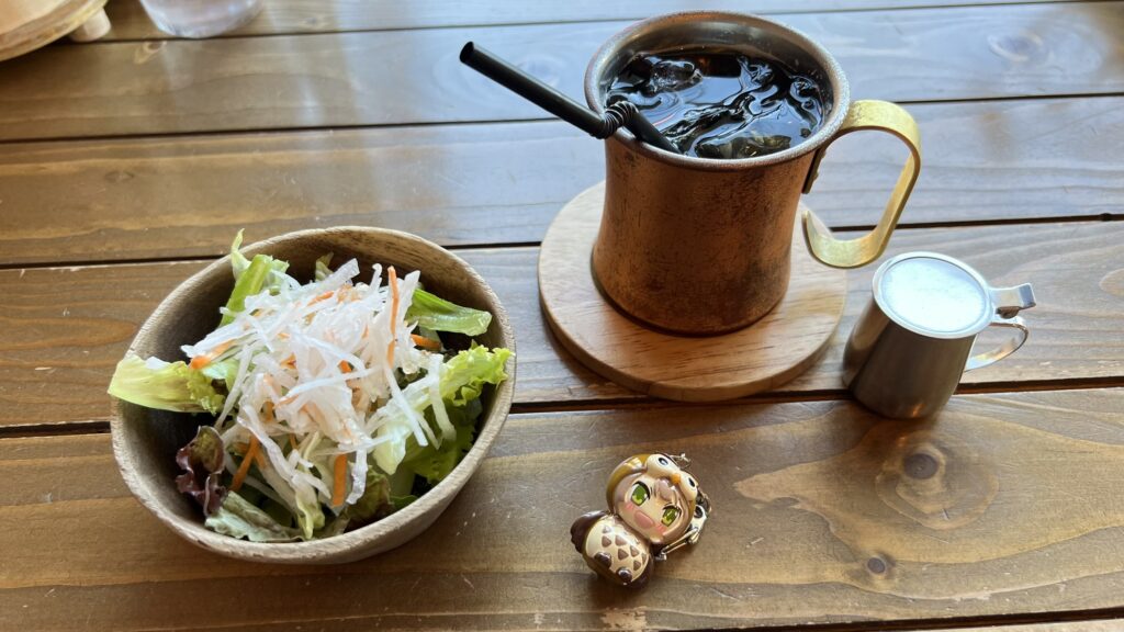 セットにはシャキシャキ野菜のミニサラダと、冷たいアイスコーヒーが付属。