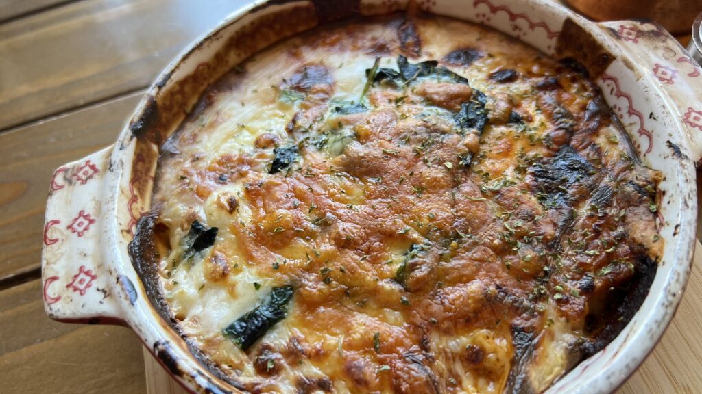 チーズの下にはまろやかなホワイトソースとケチャップライス、そしてゴロっとしたチキンとほうれん草。