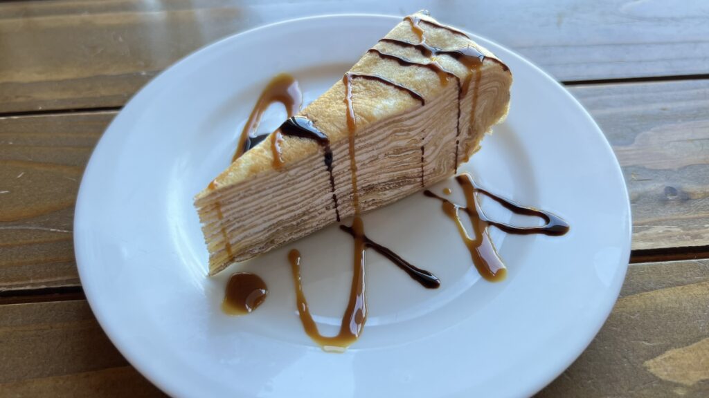 さらに、デザートにはキャラメルとチョコソースがかかったミルクレープが登場。