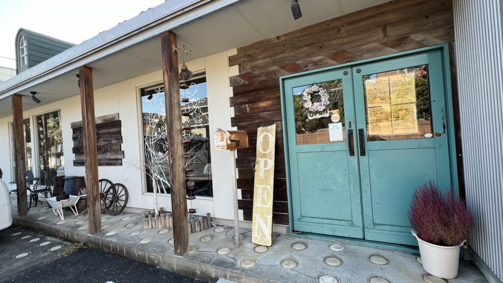 白壁とウッドパネルの組み合わせに、ターコイズブルーのドアとリースがアクセントを添え、入口前にはミルク缶や車輪など、雰囲気たっぷりのアイテムが並びます。