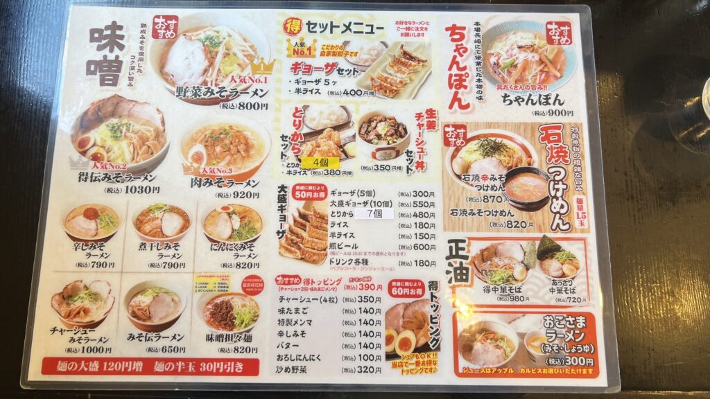 看板の「野菜みそラーメン」をはじめ、チャーシューがたっぷり乗った得伝みそラーメン、肉みそラーメンなど、味噌ベースだけでも多彩なラインナップがあります。