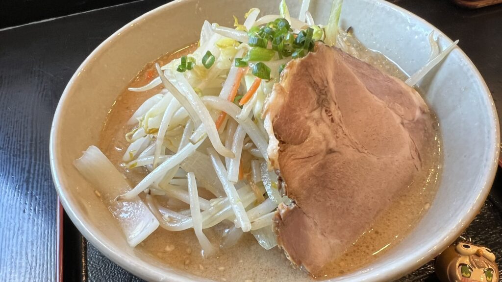 もやしやキャベツ、にんじんなどの炒め野菜がどっさりと盛られ、その脇には大きなチャーシューが添えられていて、見た目からもボリューム感のある一杯です。