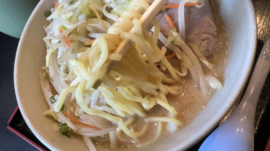 中太のちぢれ麺はほどよい弾力があり、スープをよく絡めて運んでくれます。