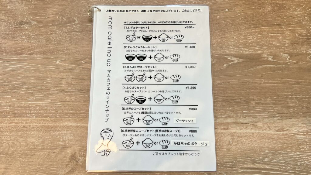 食事メニューは「スープ」と「カレー」を中心に構成されており、好みに合わせて好きなセットを楽しめます。