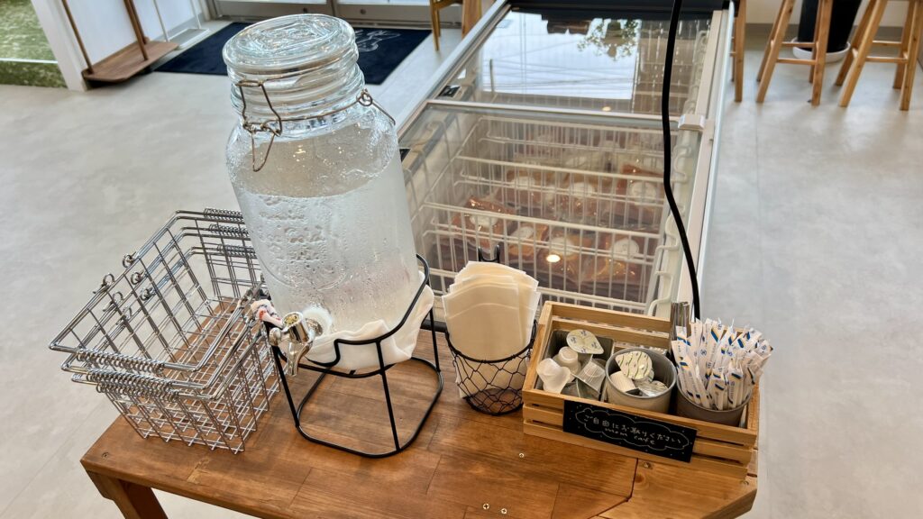 中央にはセルフのお水コーナー・砂糖・ミルクが設置され、自由に利用できます。