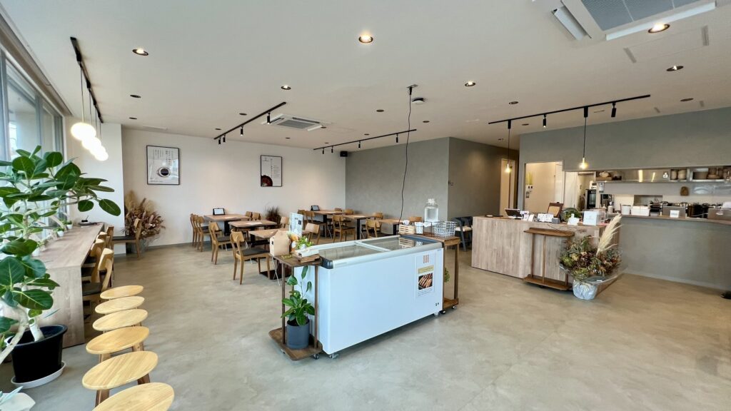 店内は白壁とコンクリートの組み合わせが美しい、明るく開放的な空間。