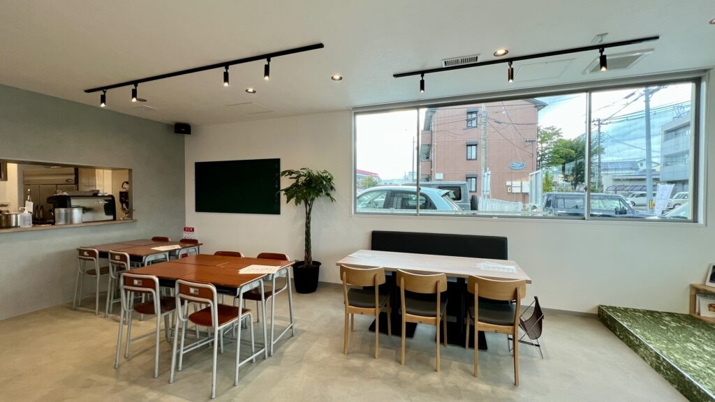 木目のテーブルとイスが整然と並び、観葉植物が彩りを添えて、シンプルながら温かみのあるインテリアが特徴です。