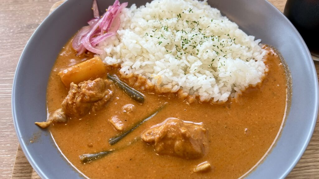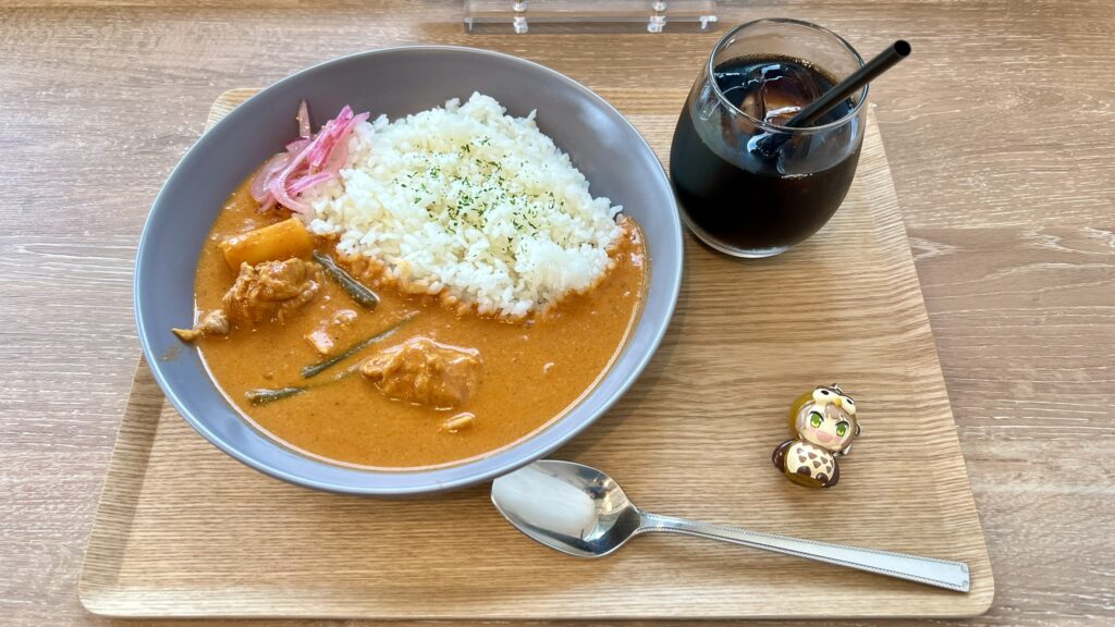 木のトレーに盛られたカレーからは、ふわっとスパイスの香りが広がり、自然と食欲がそそられます。