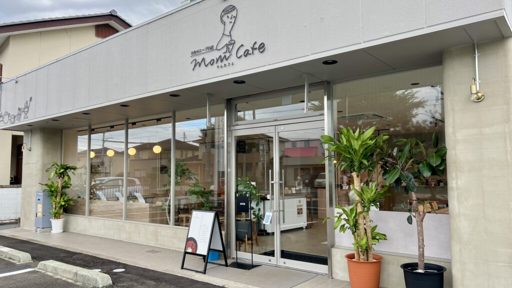 グレーを基調としたスタイリッシュな外観に、大きな窓が印象的な「mom cafe」。