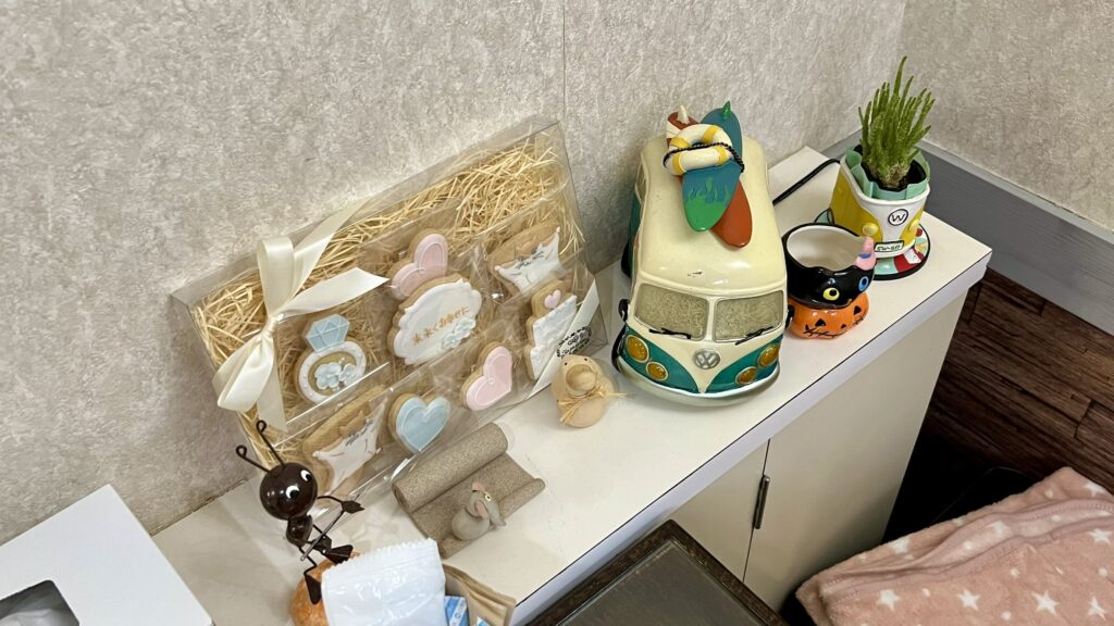 壁や棚にはモモンガを中心とした小物やぬいぐるみが並び、穏やかな空気が流れています。