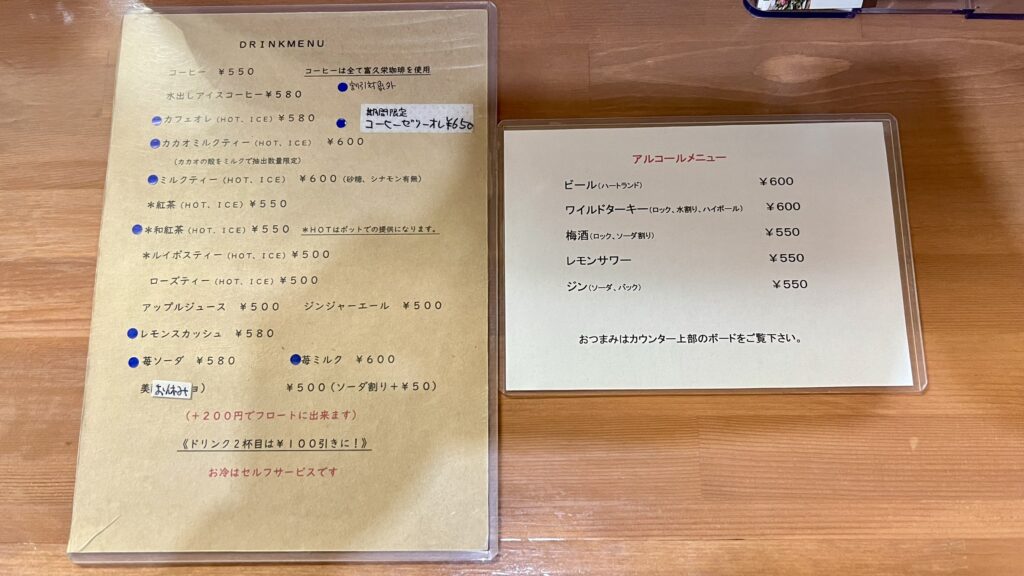 ドリンクは定番のコーヒー・紅茶のほか、苺ソーダやレモンスカッシュなども充実。