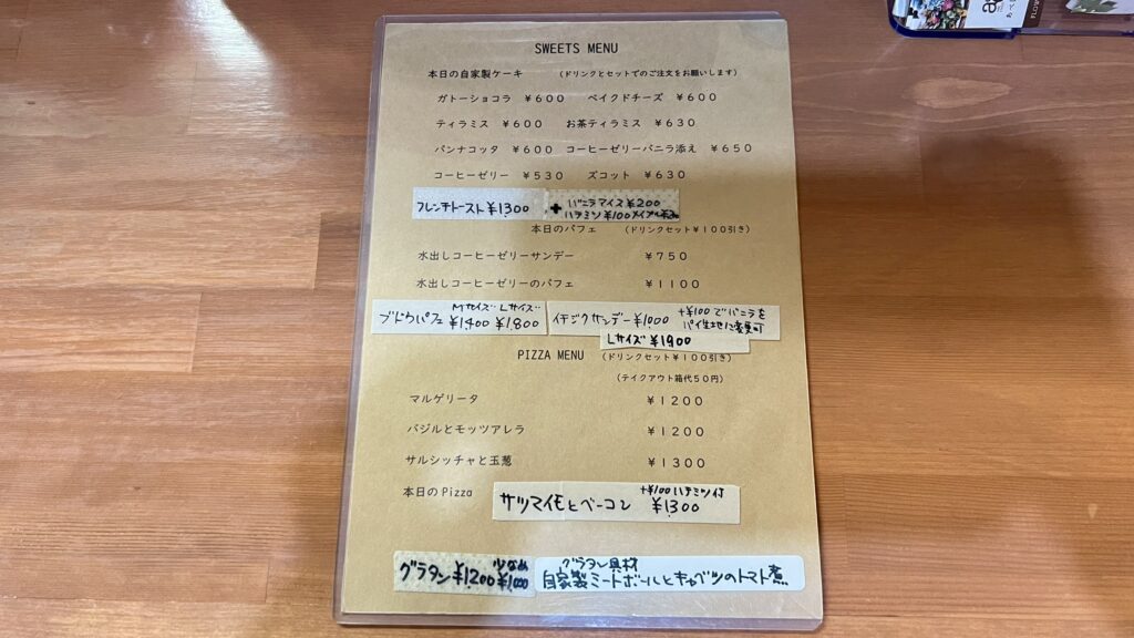 スイーツメニューも豊富で、ガトーショコラやティラミス、パフェなどカフェらしいデザートが揃います。