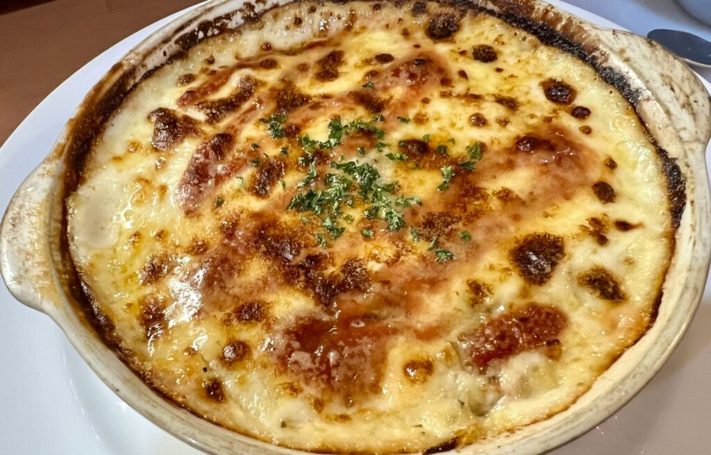 皿のふちまでこんがりと焼き色のついたチーズが広がり、見た目から食欲をそそります。