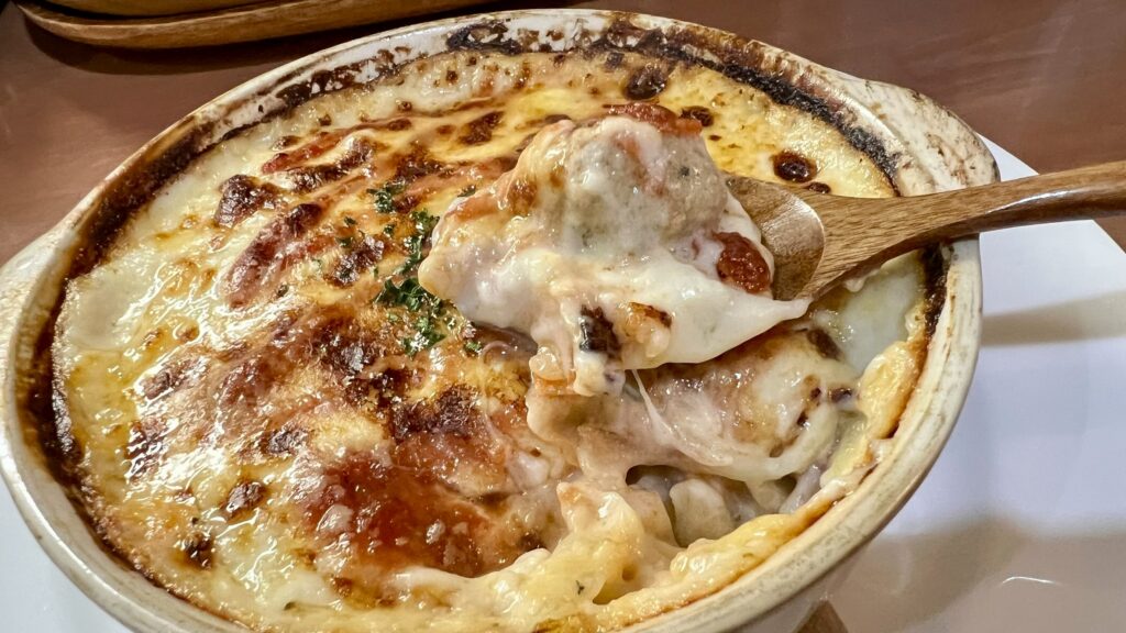 ホワイトソースのまろやかさとトマト煮の酸味、チーズのコクがひとつに重なって、奥行きのある味わいです。