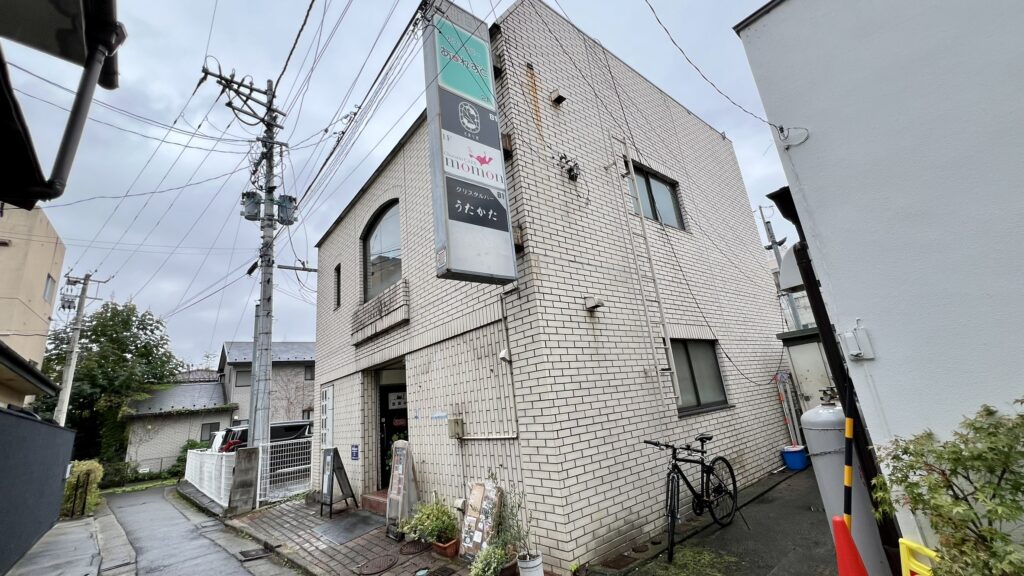 白いレンガ風の外壁が目を引くビルの1階にある「ちょこっとカフェももん」。