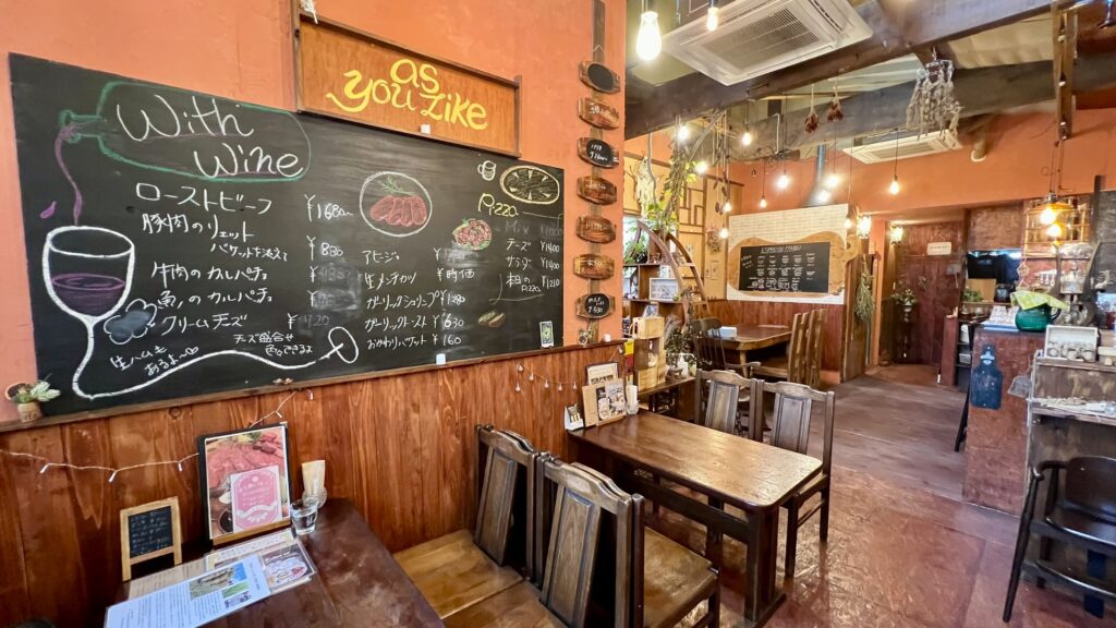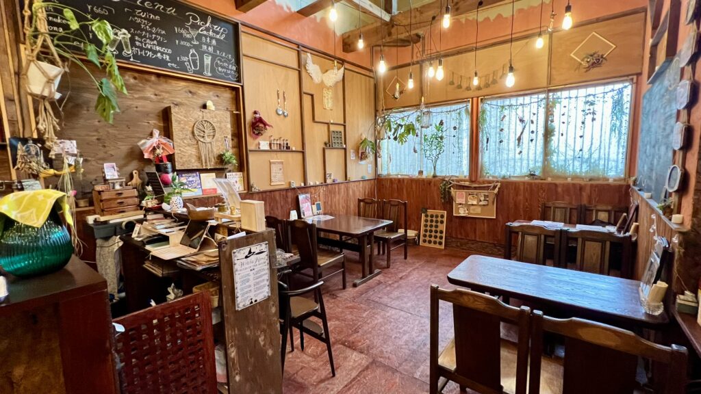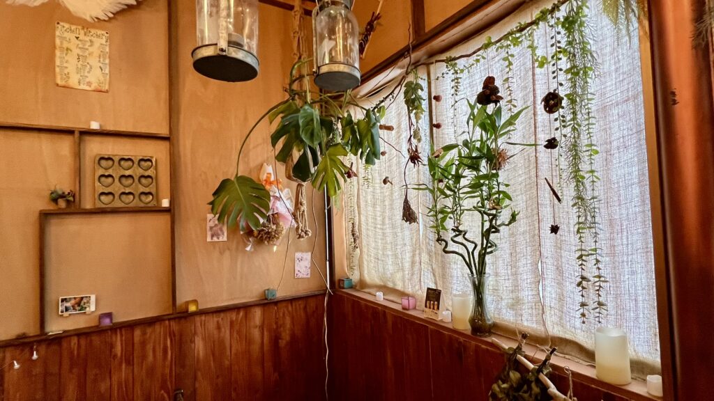 アンティーク調の照明や、壁に飾られた雑貨・植物が温かみのある雰囲気を演出しています。