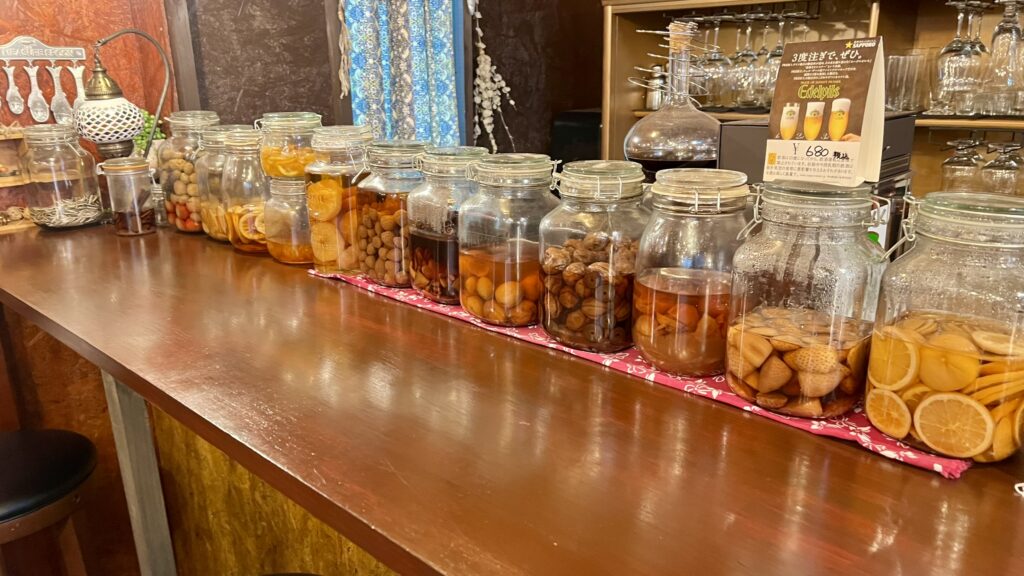 カウンターには果物のシロップ漬けやアルコール類が整然と並び、上質で落ち着いた空気が漂います。