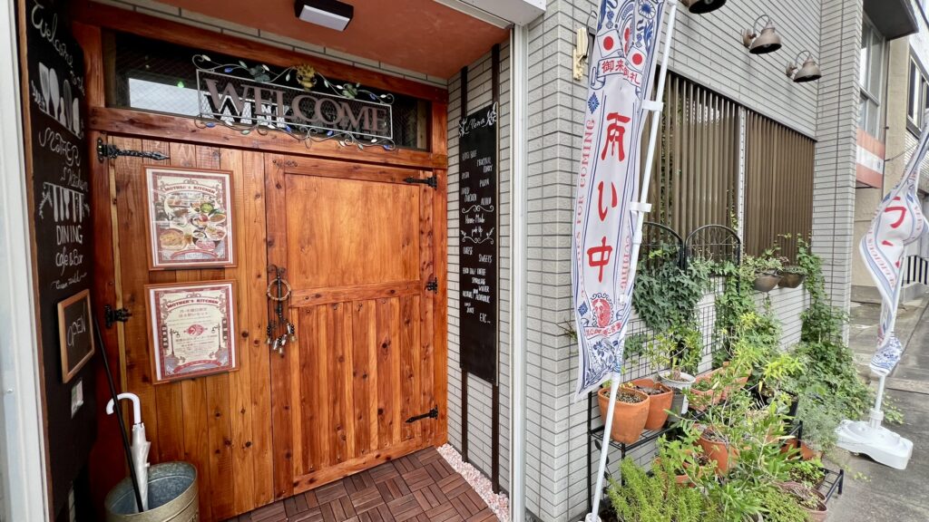立派な木製ドアと「WELCOME」のサイン、そしてのぼりが目を引きます。