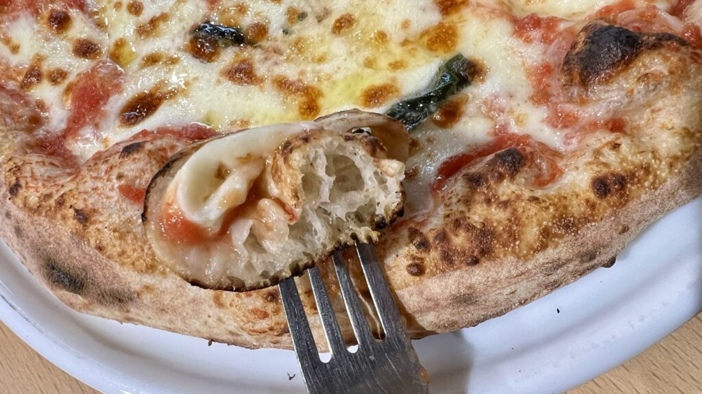 「耳までおいしく食べるコツ」に倣って切り分けていただくと、外は軽くパリッと、中はモチモチ。