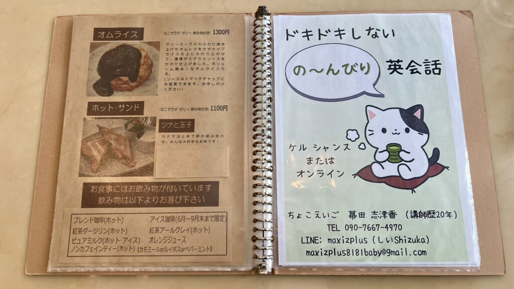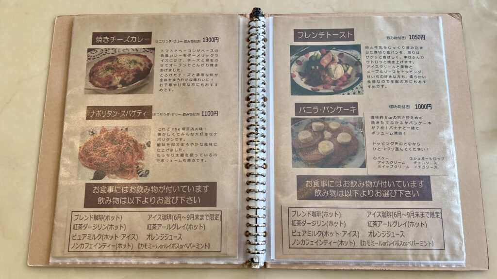 焼きチーズカレーやスパゲティ、オムライスなど、どれもドリンク付きのセットでいただけるのが嬉しいポイントです。