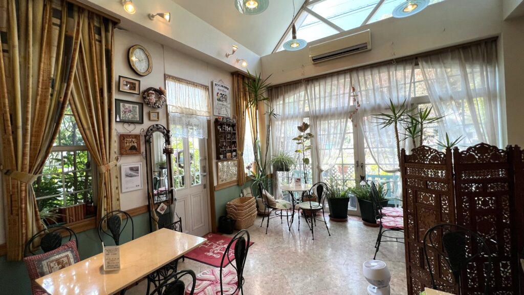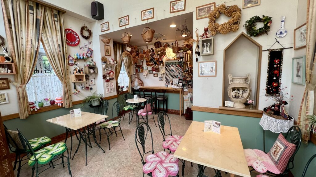 店主様が集めた可愛らしい雑貨や人形、季節を感じる飾りや植物が並び、あたたかみのある雰囲気をつくり出しています。