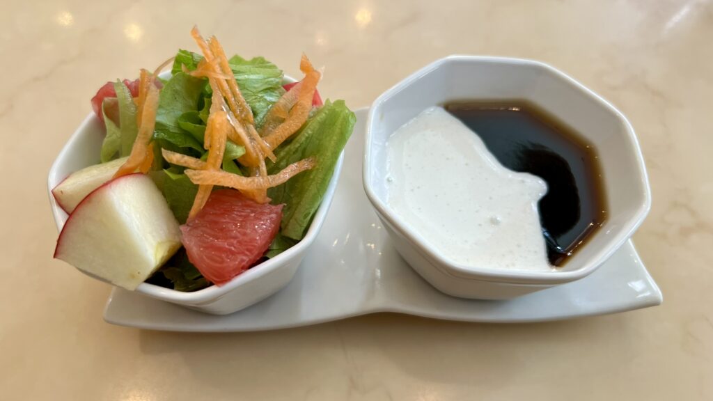 セットのサラダには、りんごやグレープフルーツなどのフルーツが添えられ、色鮮やかで爽やかな印象。