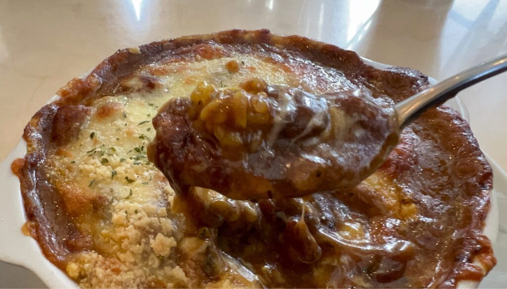 スプーンを入れると、濃厚なチーズの下からトマトベースの欧風カレーとベーコンが現れ、中央にはとろりとした卵も。