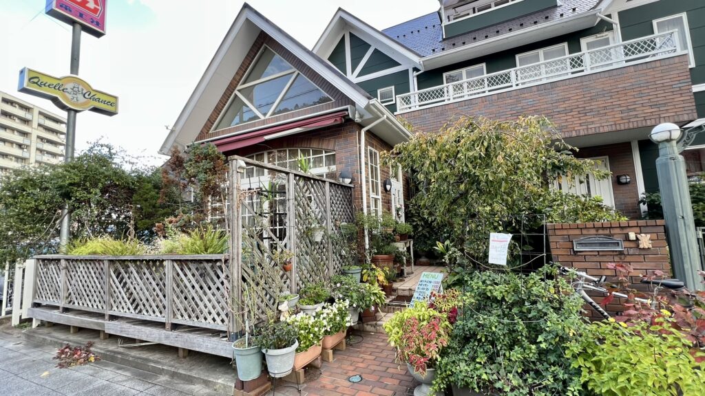 赤い屋根とレンガ風の壁、たっぷりの植物に囲まれた「ケルシャンス」は、温かみのある佇まいが印象的な喫茶店。
