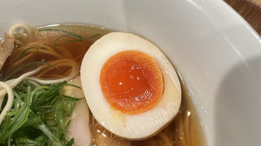 味玉は、黄身の中心がとろりとした半熟で、スープとなじむ優しい味付けです。