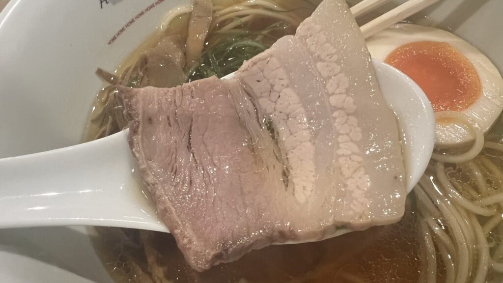 トッピングのチャーシューは、しっとりとやわらかく仕上げられていて、口に入れるとほろりとほぐれてやさしい肉の旨みが広がります。